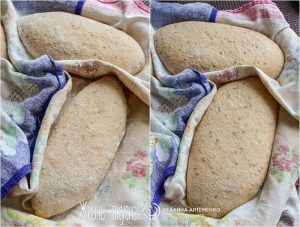 - Теперь уложите тесто швом вниз на щедро присыпанное мукой/манкой полотенце, накройте, и оставьте для расстойки часа на 2 (у меня расстойка длилась около 3,5 часов). Хлеб должен увеличиться вдвое.