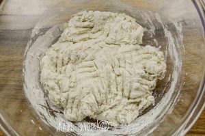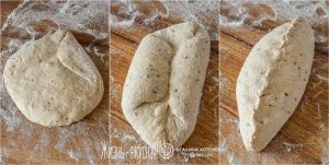 - Формовка несложная: посыпьте стол кукурузной мукой/манкой, аккуратно расплющите шарик теста, заверните края с четырех сторон, как будто сворачиваете конверт. После этого с двух сторон по направлению к центру сверните тесто рулетом, и хорошенько защипите.