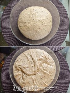 - На момент, когда хлеб расстоится, духовка должна быть нагрета до 250° вместе в противнями/камнем (я пекла на двух одновременно в режиме конвекции, это неправильно, но…).