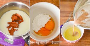 - Желтки перемешайте с сахарной пудрой. Тоненькой струйкой влейте немного арахисово-молочной смеси в желтки, интенсивно помешивая.