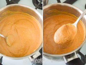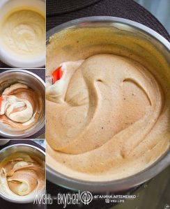 - Затем вылейте темперированные желтки в остальное молоко и доведите на маленьком огне до загустения. Масса станет прямо густая, как крем. И комковатая – это все частички арахиса. Остудите ее.