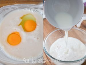 - Когда дрожжи начнут играть и пениться (10 минут), добавьте оставшееся молоко, яйца, соль, сахар и муку. Можно добавить ваниль.