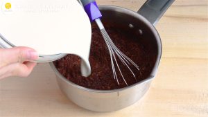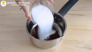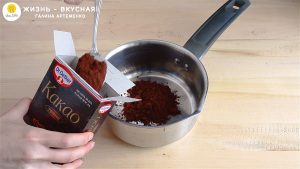 - В сотейник отправляю какао и сахар. Перемешиваю. Так как этот какао-порошок жирный (20-22%), он привнесет максимум аромата.