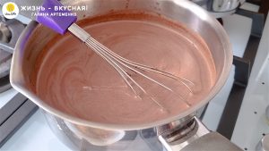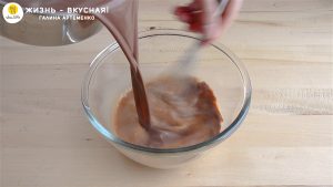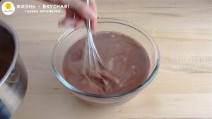 - Вливаю тонкой струйкой горячую шоколадную смесь, непрерывно перемешивая массу. Так желтки и яйца не свернутся.
