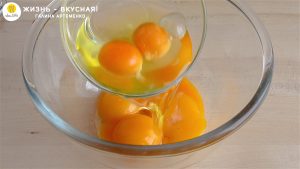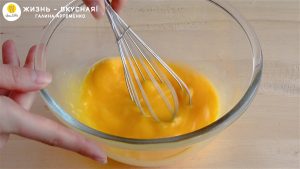 - Параллельно в глубокой миске взбиваю венчиком яйца с желтками. Кстати, из оставшихся белков приготовьте такие вот кексы.