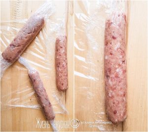 - Обернув фарш в пищевую пленку, плотно обвяжите концы какой-то хлопковой ниткой. Батоны должны получиться плотными, не вяленькими! Если запас пленки у краев достаточный, можно завязать ее узелком. Ориентируйтесь по ситуации. На сосисках, например, это удобно.
