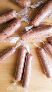- Теперь разделите фарш на две части и плотно заверните каждую часть в пищевую пленку, придав им форму батона. По возможности выгоните все пузыри воздуха.