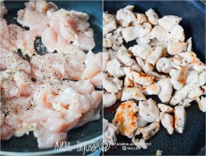 - Пока месится тесто, можно приготовить начинку. Для этого я обжариваю нарезанное куриное филе, добавив соль и перец.