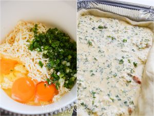 - Затем на тесто выкладываю курицу и заливаю смесью из яиц, сыра и зелени.
