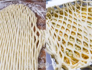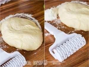 - Делаю тесто-сеточку при помощи специального девайса. Конечно, можно сделать ее и ручками, делая продолговатые прорези в тесте в шахматном порядке, но с помощником этот процесс занимает секунды! Получившейся сеточкой нужно аккуратно покрыть верх пирога, равномерно ее растягивая.