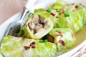 Зацепили они меня не сколько самой по себе молодой капустой (хоть влияние ее жизнеутверждающего зеленого цвета нельзя игнорировать!). Зацепили они меня больше тем, что готовятся без фарша — в качестве начинки тут используется фасоль и шампиньоны.