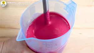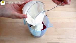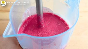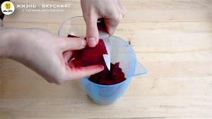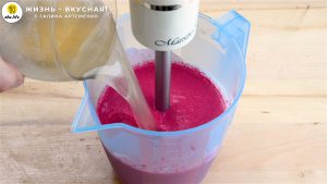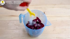 - Перемешиваю жидкость и вливаю ее в свекольную массу. Пробиваю смесь блендером еще раз.