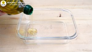 - Теперь смазываю небольшой лоток растительным маслом — это будет форма для желе, а масло поможет его легко извлечь.