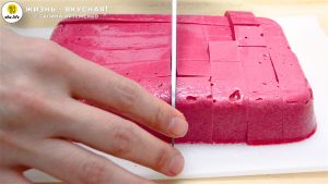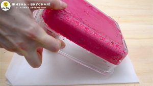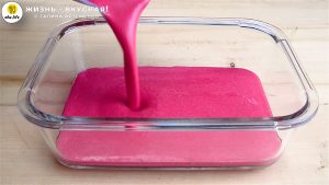 - Выливаю свекольную массу в лоток и убираю в холодильник до полного застывания. Если хочется, чтобы это желе схватилось побыстрее, отправьте лоток в морозилку на 20-30 минут, а затем переместите в холодильник — так желе застынет очень быстро.