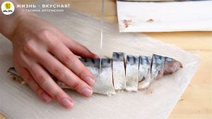 - Теперь займусь скумбрией — ее нужно очистить от кожи, разделать на филе, удалить плавники и кости. Разделанное филе скумбрии я режу кусочками шириной в 1-1,5 см (24 кусочка).