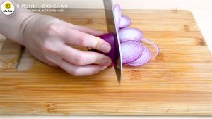 - Режу кружочками луковицу.