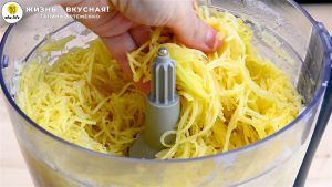 - Теперь приготовлю основание для закуски — хрустящие мини-дранички. Очищенный картофель я натираю на мелкой терке. Я не буду промывать ломтики — пускай крахмал останется и поможет скрепить основание. Тут это важно.
