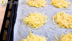 - Натертый картофель я выкладываю на противень, застеленный пергаментом и щедро смазанный растительным маслом. Щедро прям! Оно сделает нам хрустящие края. Формую небольшие драники и приплюскиваю их, чтобы уплотнить. Делаю 24 заготовки.