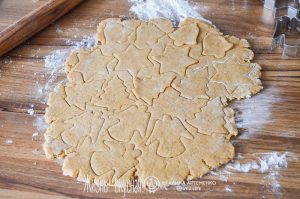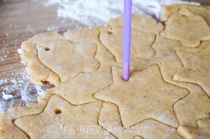 - Раскатывайте тесто в пласт толщиной 5-6 мм (можно и толще, тогда печенья получатся пухленькие) и вырезайте формочками фигурки. При помощи трубочки для коктейля вырезайте отверстия для ленточки, если вы планируете вешать печенье на елку.