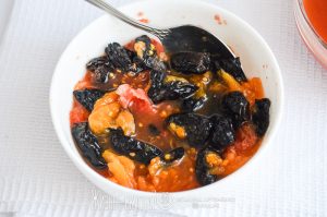 - Этим временем сок слейте с помидоров в отдельную мисочку, а сами томаты порубите. Разрежьте на половинки чернослив. Соедините томаты и чернослив. Чернослив можно брать и копченый, но тогда блюдо будет иметь более сильный и яркий аромат чернослива, который я, если честно, не очень люблю. Вяленый же чернослив станет очень мягким, нежным и придаст блюду легкую сладимость.