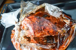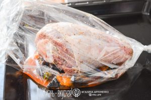 - Отрежьте рукав для запекания, завяжите его с одной стороны. Внутрь уложите томаты с черносливом, образуя подушку для рульки – благодаря этому она точно не подгорит. Сверху на подушку уложите рульку и полейте томатным соком, смешанным с оставшимися специями.