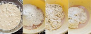 - Через 20 минут влейте половину дрожжевой воды и при помощи миксера с насадками-крюками месите тесто, пока дрожжевая вода не впитается. Затем влейте оставшуюся воду, добавьте соль и месите на средней скорости до гладкости и хорошего развития клейковины.
