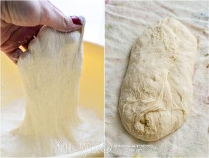 - Тесто будет липокватым, влажным, но оно будет хорошо тянуться, не обрываясь. Это и даст возможность чиабатте быть очень воздушной, крупнопористой.