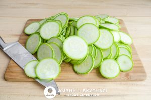 - Кабачки нарезаю кружочками толщиной в 1,5-2 мм. Отправляю кабачки в сметанную смесь и перемешиваю так, чтобы смесь с сыром покрыла кружочки.