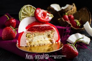 Ну что ж… я как порядочный человек, пообещавший в прошлой публикации про фруктовую глазурь дать рецепт того заманчивого пирожного, выполняю обещанное. Но это не только пирожное — это клубничный муссовый торт с кокосом и лаймом, который я готовила столько раз, что это и торты, и пирожные…