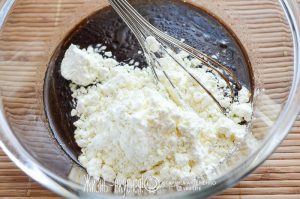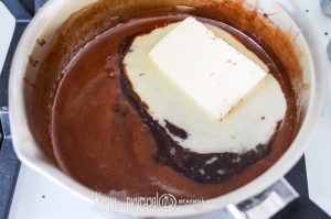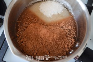 - Смешайте в сотейнике сахар, воду и какао.