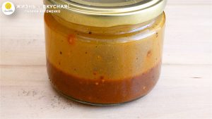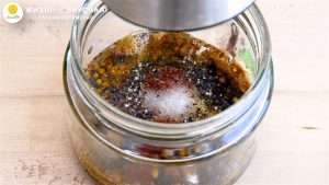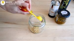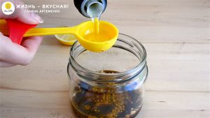 - Начинаю приготовление с заправки. Ее можно сделать хоть и за неделю, а то и две до праздника! Это яркая заправка-винегрет с азиатскими нотками. В банку отправляю сушеный имбирь.