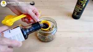 - Вливаю в банку растительное масло. Оно может быть любым по вашему вкусу, я использую кунжутное — чтобы поддержать азиатскую тему.