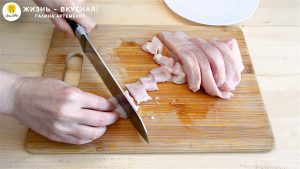 - Займусь куриным филе. Режу его небольшими кусочками по паре сантиметров.