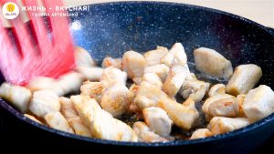 - Разогреваю сковороду на максимуме и вливаю ложку растительного масла. Отправляю обжариваться курицу, помешивая. Делать это стоит все время на сильном огне, чтобы процесс шел быстро и курочка приготовилась, но осталась сочной. Это займет минут 5. Помешивая, довожу курицу до румяных краев. В конце немного присаливаю мясо.