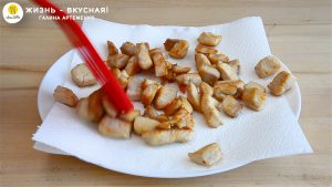 - Перекладываю готовые кусочки на тарелку, застеленную бумажным полотенцем. Оно впитает лишнее масло.