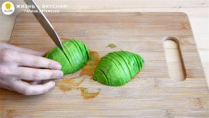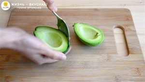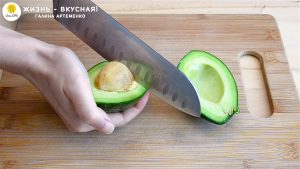 - Теперь разрезаю авокадо. Я купила чуть зеленоватый плод и дала ему дозреть. Сейчас он прекрасный — уже спелый, но еще упругий и я смогу его нарезать. Извлекаю косточку и достаю мякоть.