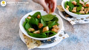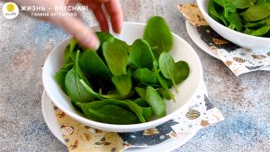 - Отправляю в тарелку порцию листьев шпината. Зелень тут может быть любой: просто латук, айсберг, руккола, какое-то ассорти, или просто нарезанная пекинская капуста — все отлично подойдет!