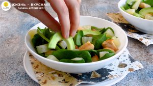 - Раскладываю кусочки авокадо. Его маслянистость создаст приятную базу. Вкус салата будет глубже, а сам салат — сытнее.