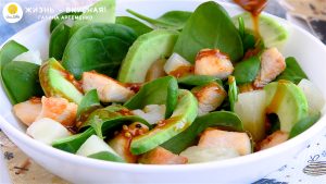 Начинаю с салата с курицей, ананасом, авокадо и заправкой в азиатском настроении.
