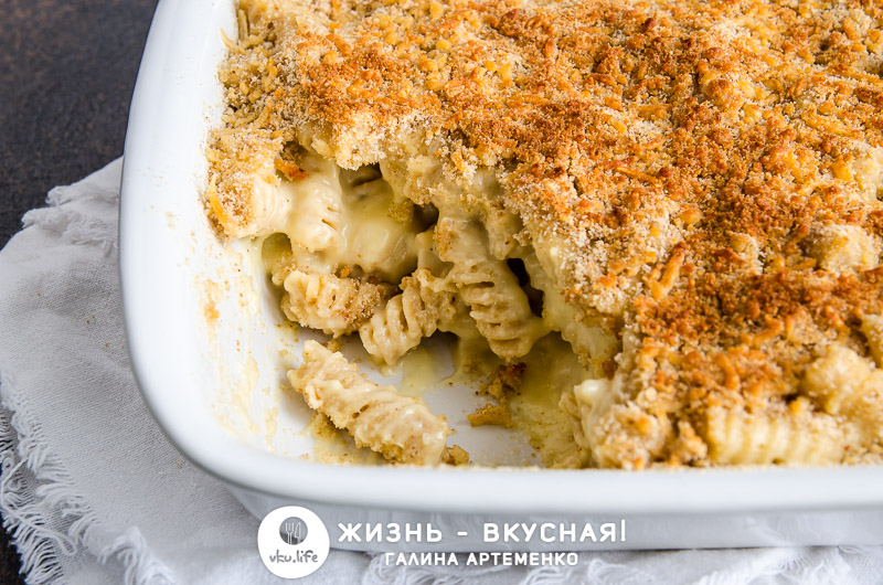- В форму для запекания выкладываю макароны в сырном соусе и разравниваю слой. Посыпаю макароны сверху смесью из сыра и панировочных сухарей. Отправляю в духовку под гриль на 3-4 минуты, пока корочка не зарумянится.