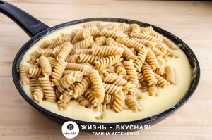 - Отправляю макароны в соус и перемешиваю, чтобы соус покрыл их со всех сторон и попал во все-все углубления!