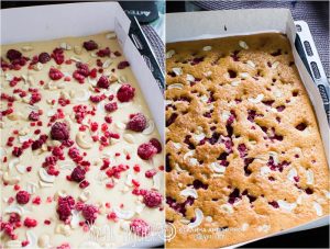 - Все ингредиенты, кроме малины и орешков, смешать венчиком или в миксере насадкой лопатка (без взбивания, лишь тщательно смешать), вылить на противень, охладить мин. 4 часа. Посыпать орешками и замороженной малиной, выпекать при 180° 15 минут.