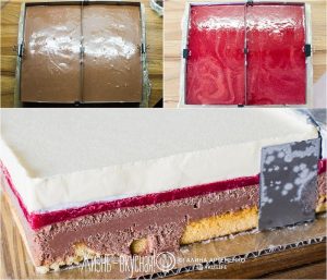 - Для желе: желатин замочить в 50 г воды с 6 г лимонного сока, дать набухнуть. Малиновое пюре смешать с сахаром, слегка подогреть, чтобы растворить сахар. Отдельно распустить желатин, ввести его в малиновое пюре. Остудить желе до комнатной температуры и вылить поверх предыдущего слоя.