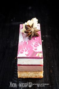 - Касательно декора — тут решать вам и зависит от того, как вы будете торт подавать: в видео цельного торта, пирожных… К примеру, на моих фото торт в зеркальной глазури, пирожные в покрытии зеркальной глазурью, а также можно покрыть просто нейтральной, чтобы защитить их, но сохранить прозрачность для демонстрации слоев. Я часто укладывала звездочки бадьяна, так как они выглядят очень эстетично, и в целом можно притянуть их сюда по тематике… Еще можно завелюрить, оформить глазурью гурмэ на белом шоколаде, или просто оформить кремом шантильи. Словом, решать вам!