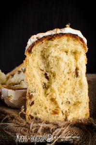 Мои куличи получились в этот раз пышными, как никогда – я даже не смогла их ровно разрезать, а поэтому поступила по-простому: разломала, и все тут. Красиво и непередаваемо ароматно: вся квартира была наполнена ароматом мускатного вина!