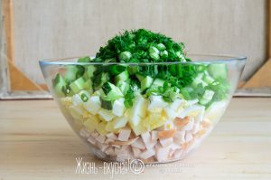- Пришла очередь зелени. Мелко порубите ее. Мне больше всего нравится именно комбинация зеленого лука и укропа. Зеленый лук пикантный, но не слишком, как репчатый, например, а укроп придает приятную свежесть. Можно также добавить петрушку, но на мой взгляд тут она раскрывается не так хорошо, как в теплых блюдах.