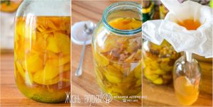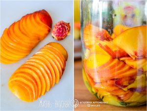- Персики разрежьте напополам и нарежьте как можно более тонкими пластинами. Косточки тоже пригодятся – они придадут легкий амареттистый аромат. Уложите персики и косточки в банку.
