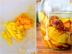 - Далее добавьте в банку цедру лимона и апельсина, залейте все водкой, а затем влейте остуженный сахарный сироп. Перемешайте, закройте крышкой, встряхните, откройте, понюхайте и насладитесь, закройте, и отправляйте на настаивание.