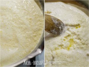 - Вылейте молоко в кастрюлю и на маленьком огне доведите его до кипения, когда молоко начнет створаживаться.