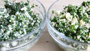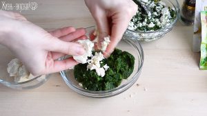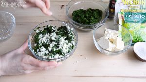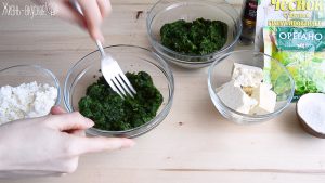 • Подготовьте 2 варианта начинки. Для этого разделите поровну шпинат. Я использовала замороженный, так что дала ему оттаять.